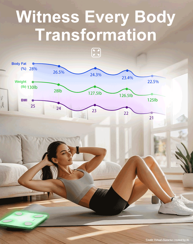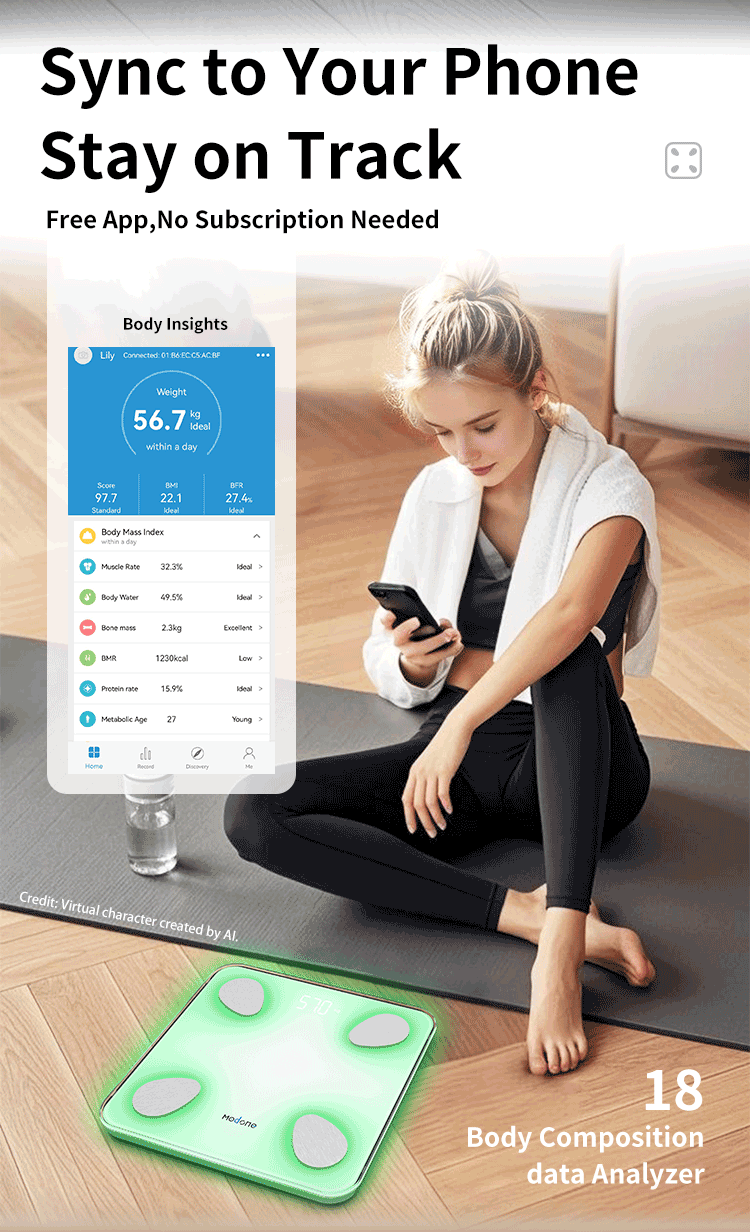 18 KEY BODY INGREDIENT METRICS ANALYSIS. Bodyweight, body fat percentage, BMI, bone mass, protein, muscle mass, Moisture, Bone Mass, BMR, Visceral Fat, Body Age, Standard Weight and more. The app displays your progress in charts with weekly, monthly, and yearly views. Also, easy to set goals and save historical data.